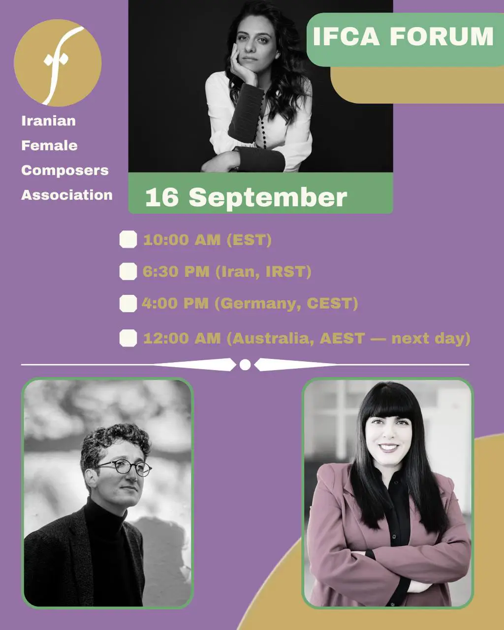 Mahan Mirarab, the musical director of the ensemble, has lived in Austria since 2009 and has worked as a freelance musician since 2010, serving as an instrumentalist, composer, arranger, and musical director. Yalda Yazdani, the curator and Artistic director of the Inner Unity Ensemble, is an ethnomusicologist who has curated various music festivals in Germany, such as the Female Voice of Iran, Female voice Afghanistan, Female Voice of Kurdistan and Ukrainian Female voices focusing on female singers in conflict regions.